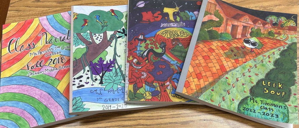 Students are writing a short story to be published in a book (all three classes included). Each student will receive a copy of the book! The above photo shows the previous books starting from 2018. Also, there is an art contest for art to be included on the covers and inside the book!
