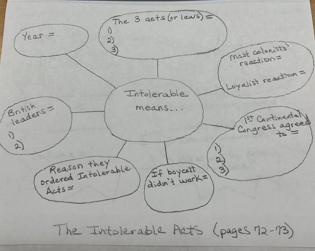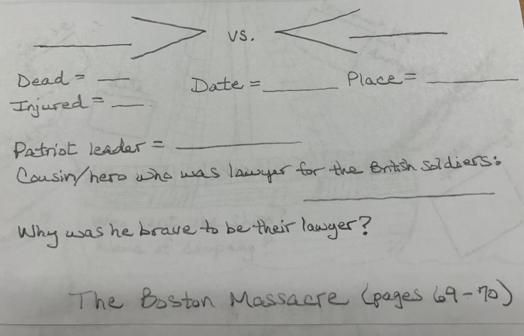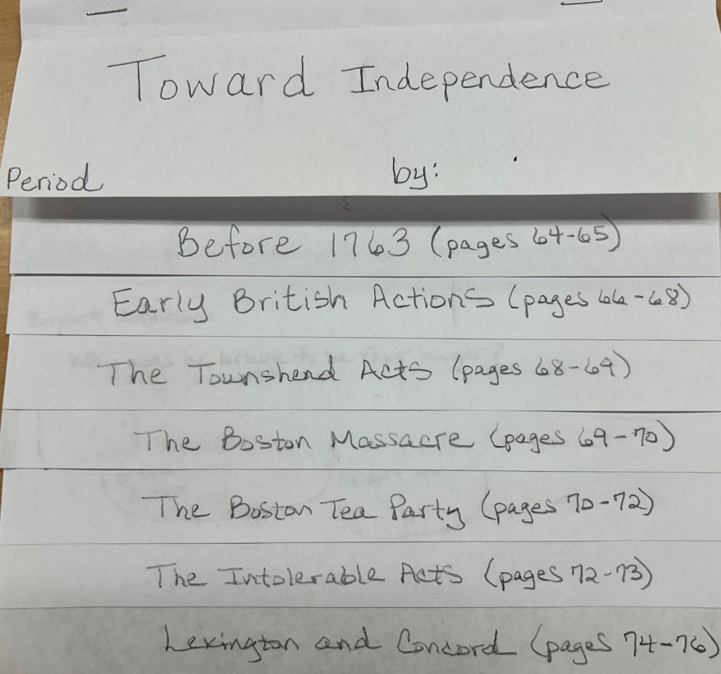 Read Chapter 5 of the Social Studies textbook to learn about the events leading to the Revolutionary War. Analyze each British action, how colonists reacted and why. As you read, create your flipbook by responding to in-depth questions about each event.